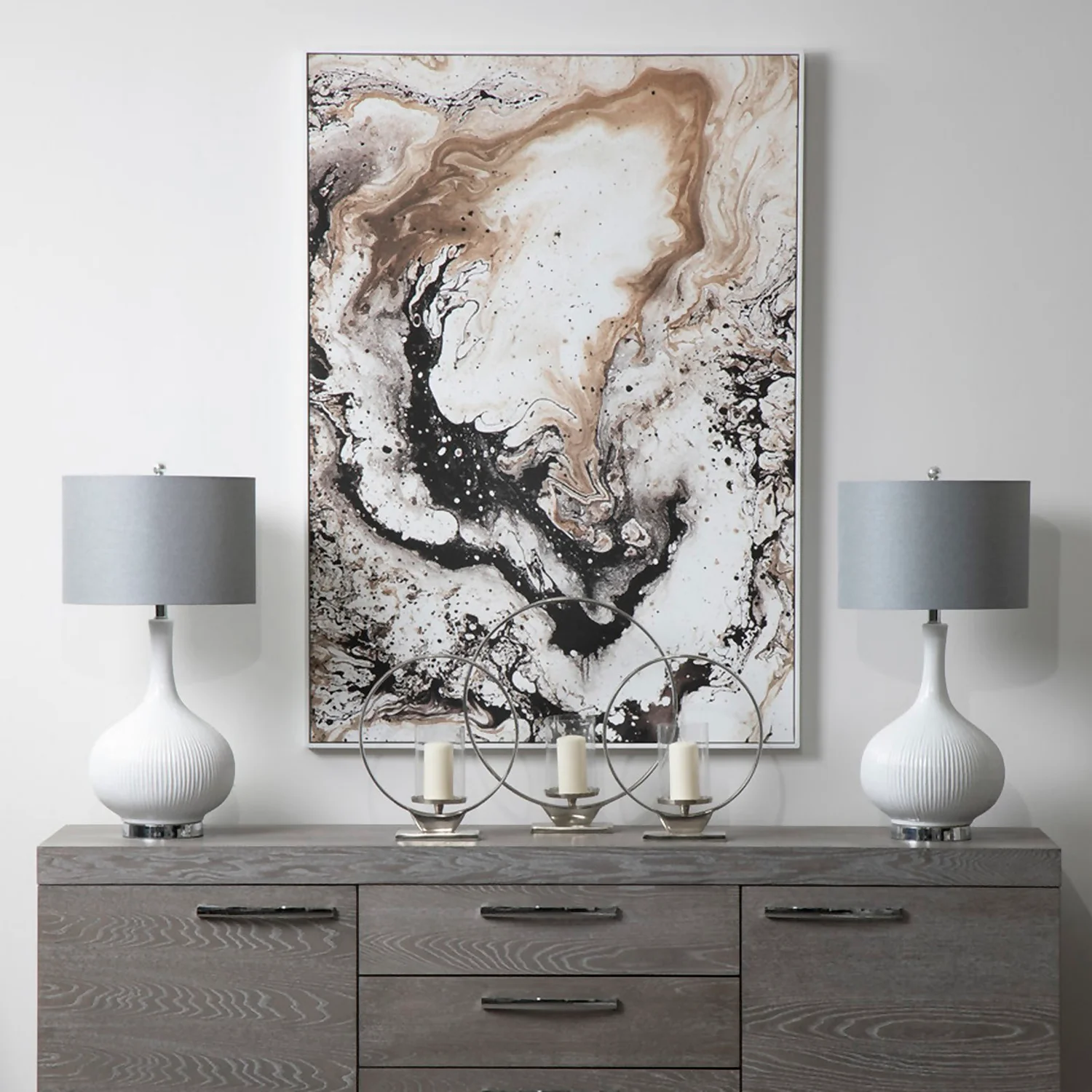 The Astratto stretches canvas within a minimal wooden frame which has a white finish. Blacks, whites and greys combine with slightly warmer ochre tones, however the overall aesthetic remains a muted and calming one. The composition is inspired by fluid mineral elements, reminding one of the beautiful inconsistency of semi-precious agate.