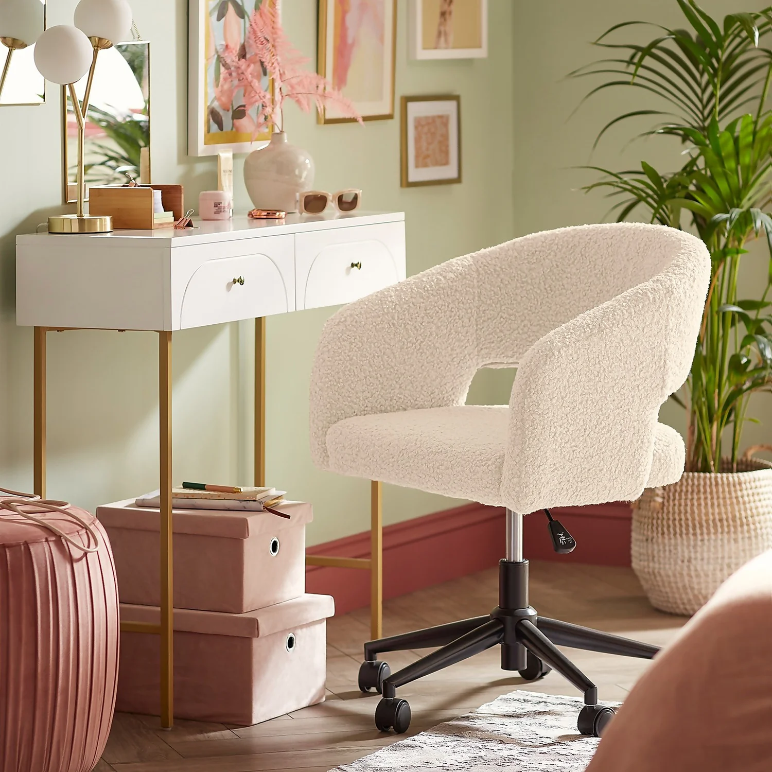 Add some elegance to you home office with our Bailey boucle office chair. Upholstered in sumptuously soft white boucle fabric and a padded wrap around back, this desk chair is as stylish as it is practical. The wheeled castor base adds to its manoeuvrability.
