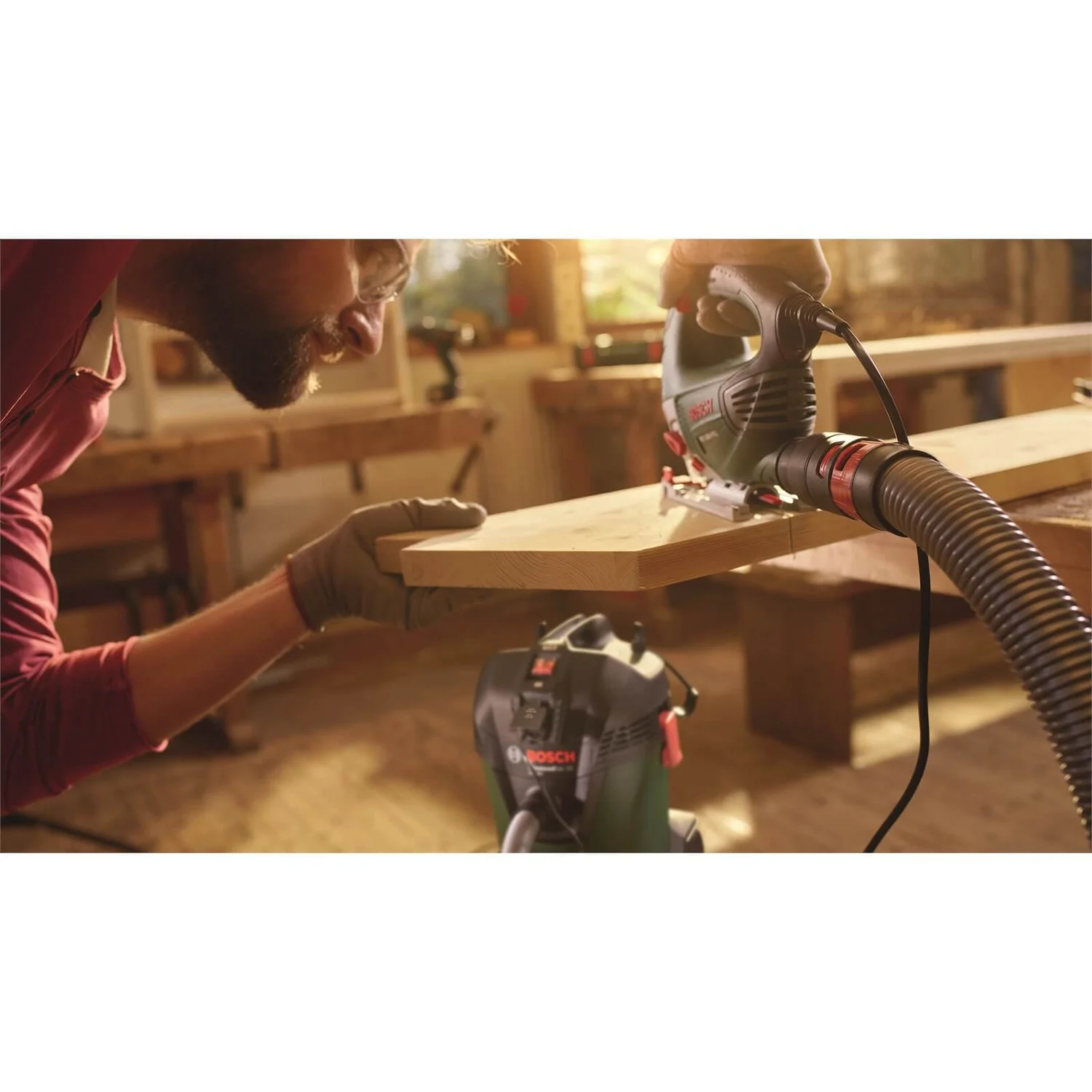 Can connect to any Bosch power tool to keep a cleaner work space and cleverly switches on and off automatically with the power tool