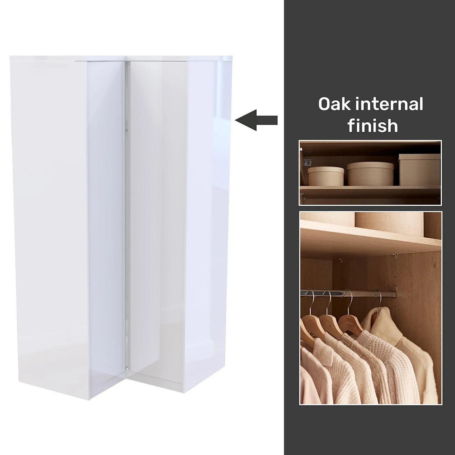This corner wardrobe (1 x double unit and corner conversion) features an oak effect carcass and beautiful luxe gloss white handleless doors. The wardrobe features premium soft close clip-on Blum hinges, five shelves and a hanging rail. You can customise your wardrobe with our additional internal storage options (available separately) including internal drawers, shelves, dividing shelves and extra hanging rails.