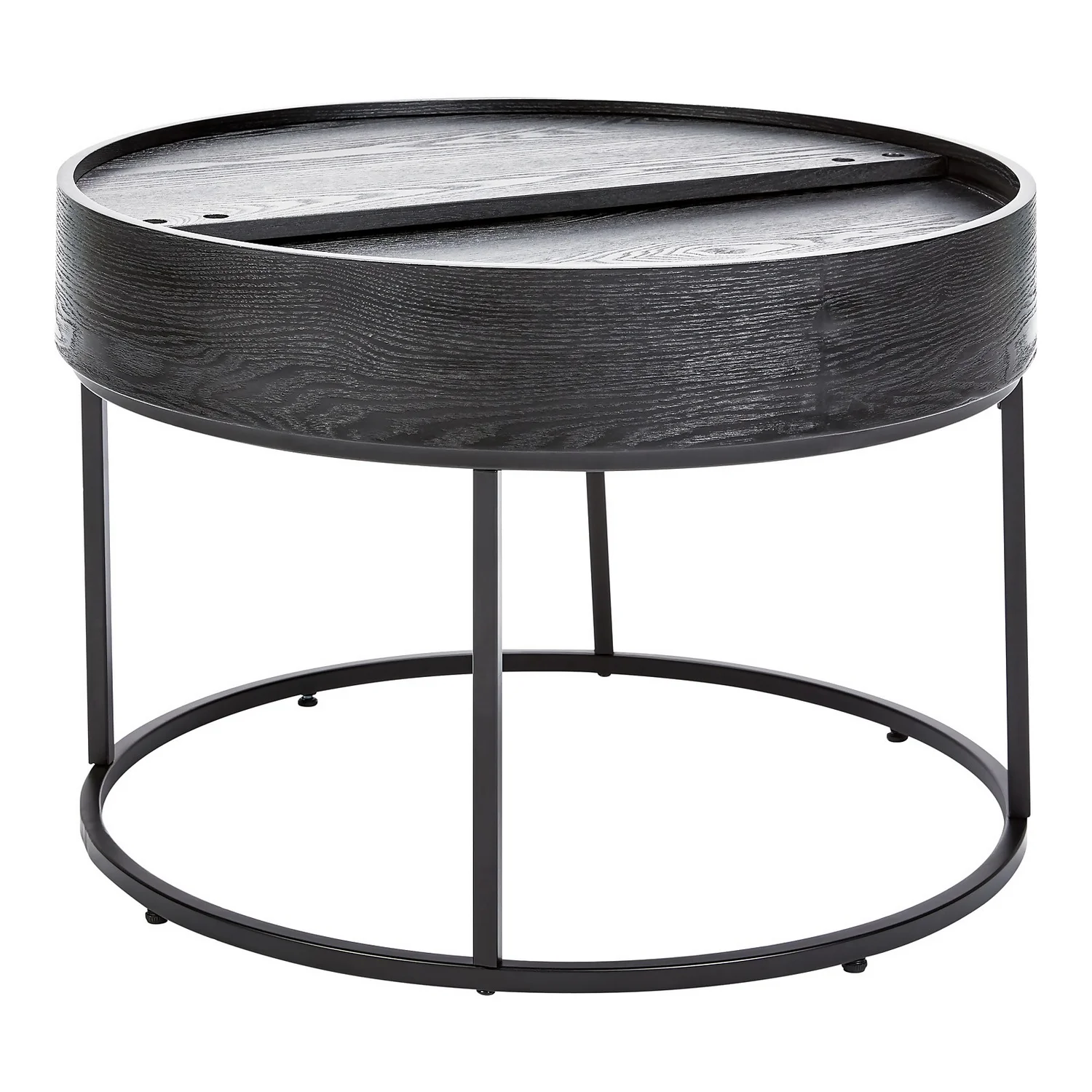 The Halo black ash coffee table has a hidden storage space in the table top and an elegant black metal base.