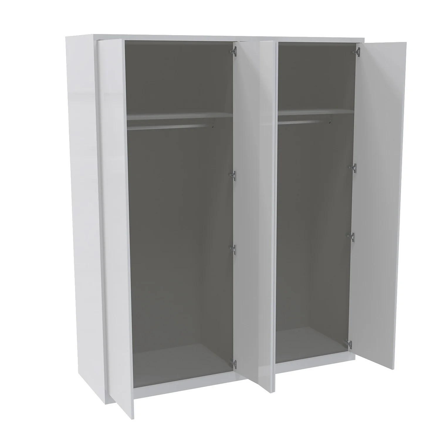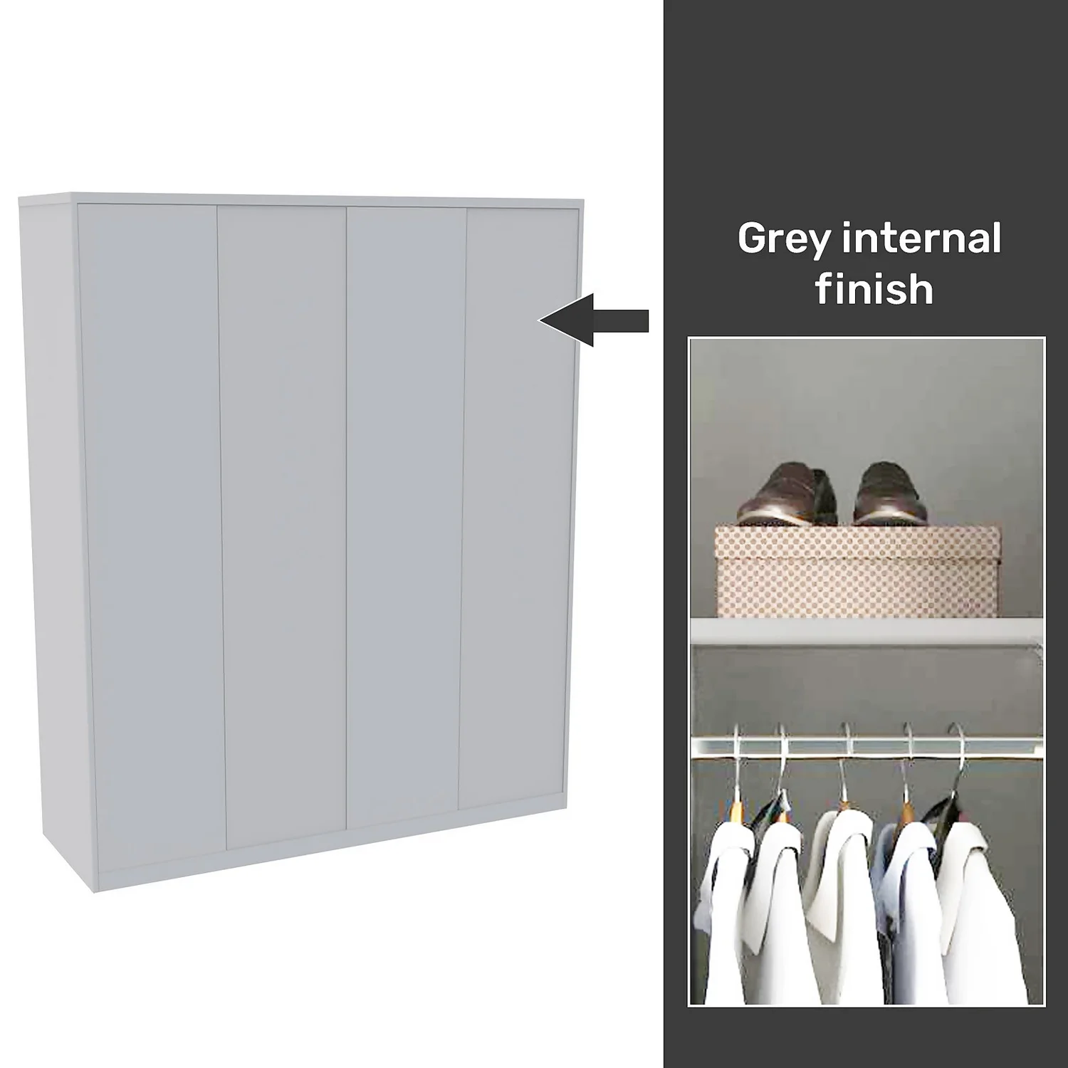 - A fitted look is achieved by using clad on panels, plinth and cornice which are all included with this wardrobe. All the elements that clad the internal grey carcass (clad on panels, plinth and cornice) are a perfect match to the gloss white slab door