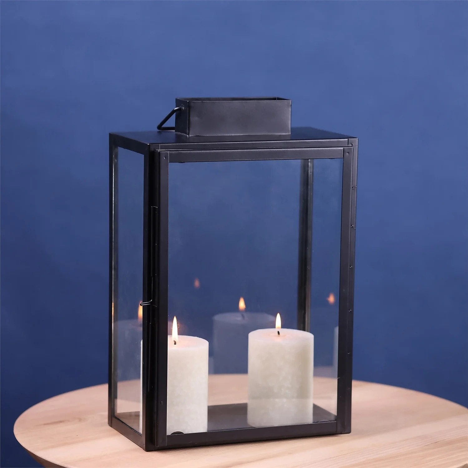 Iron part in powder coated and clear glass. Take your decor to the height of style with this large black iron lantern. Classic lines and clear glass panels make it a surefire way to add timeless chic to your living space.