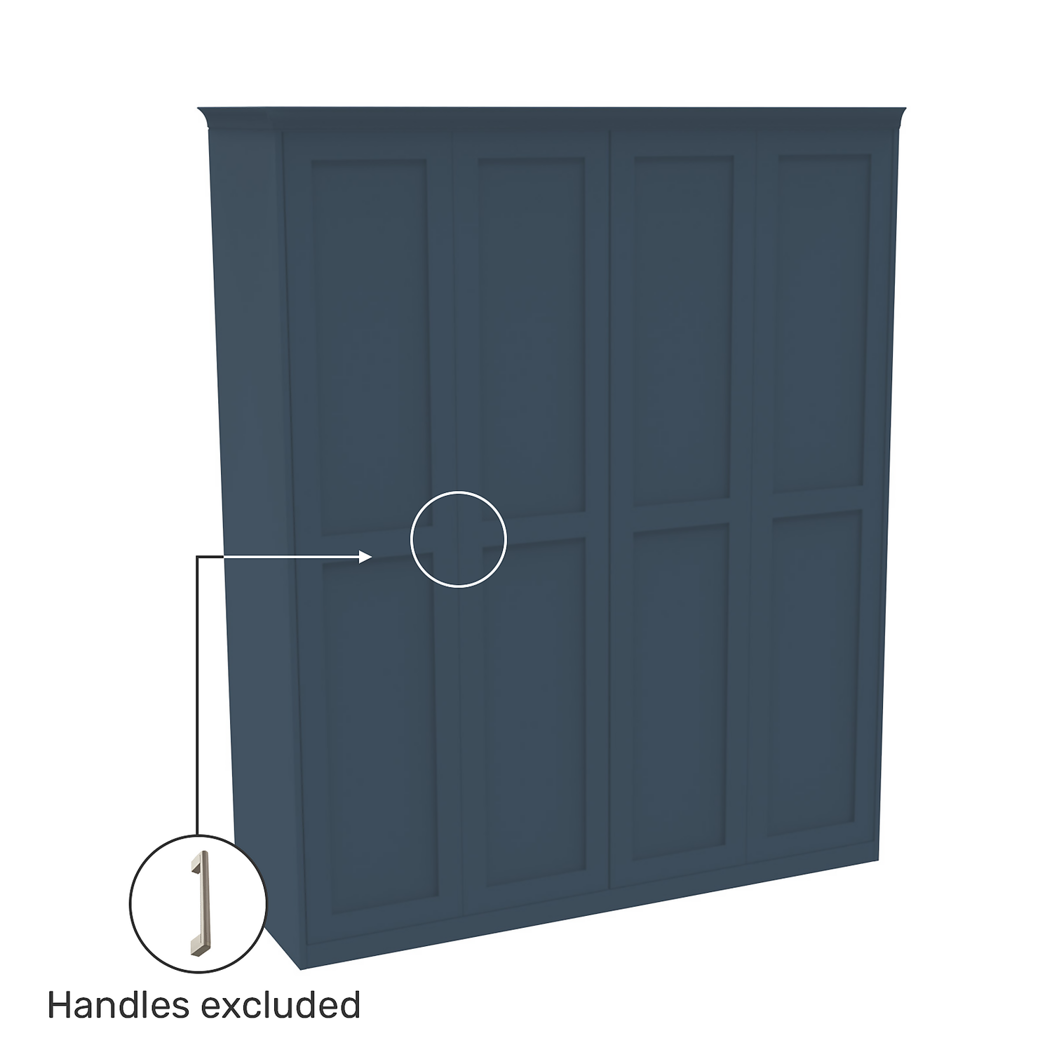 This four door wardrobe (2 x double units) features a grey internal carcass and includes end panels, plinth and matching cornice all in a finish to match the beautiful luxe matt navy blue shaker doors. The wardrobe features premium soft close clip-on Blum hinges, two shelves and two hanging rails. You can customise your wardrobe with our additional internal storage options (available separately) including internal drawers, shelves, dividing shelves and extra hanging rails. Choose your handles from our range of both traditional and modern to suit your desired look.