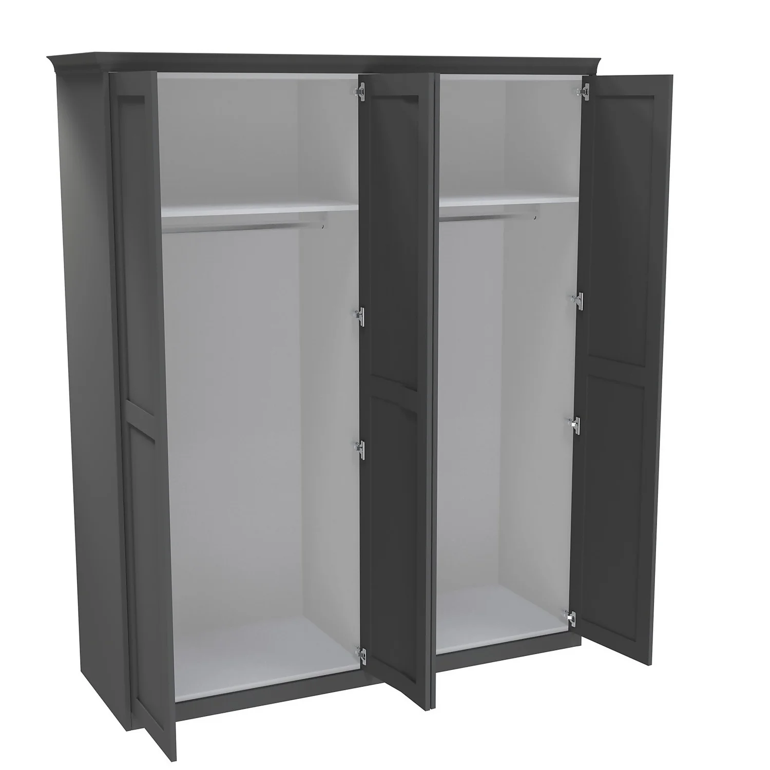 - A fitted look is achieved by using clad on panels, plinth and cornice which are all included with this wardrobe. All the elements that clad the internal white carcass (clad on panels, plinth and cornice) are a perfect match to the matt carbon grey shaker door