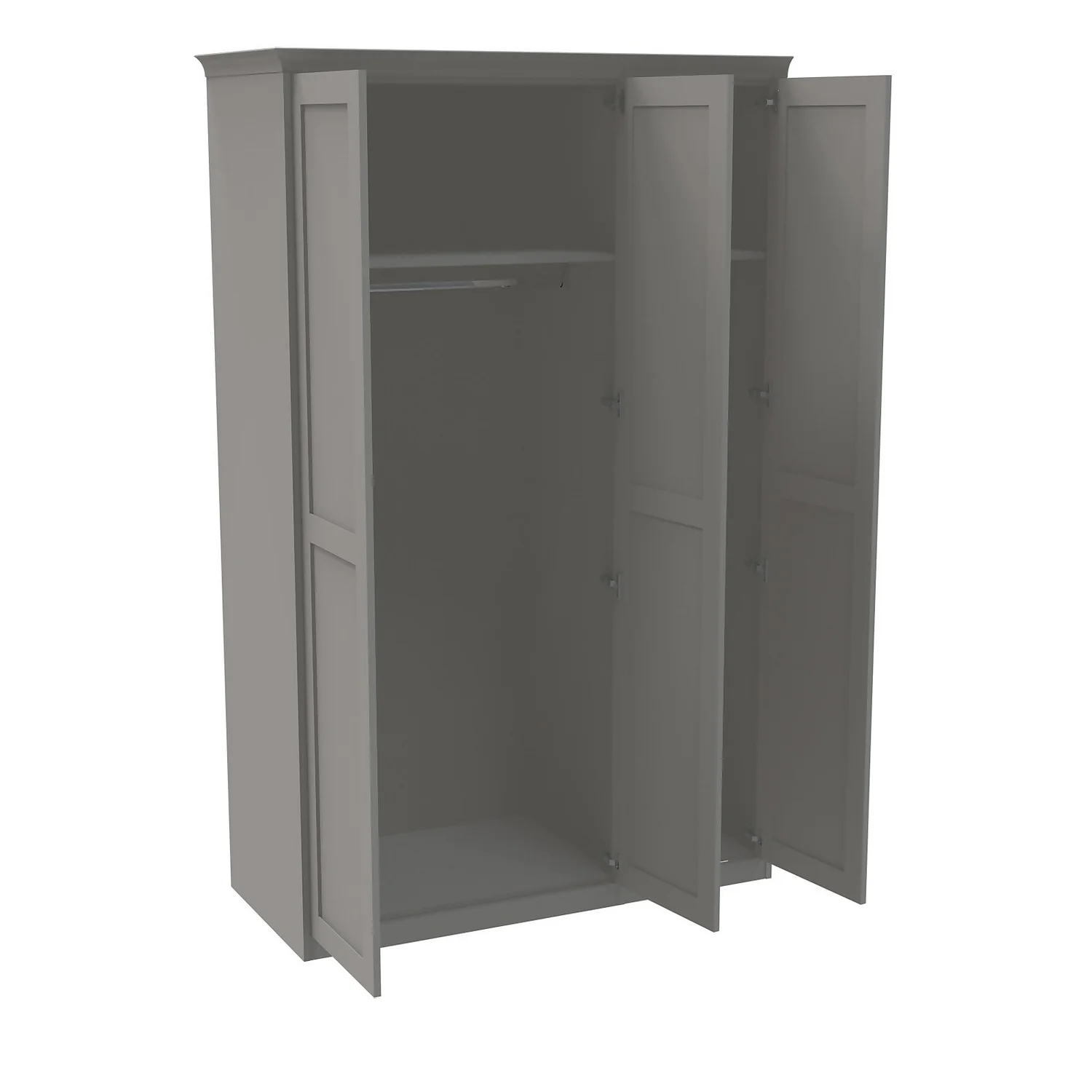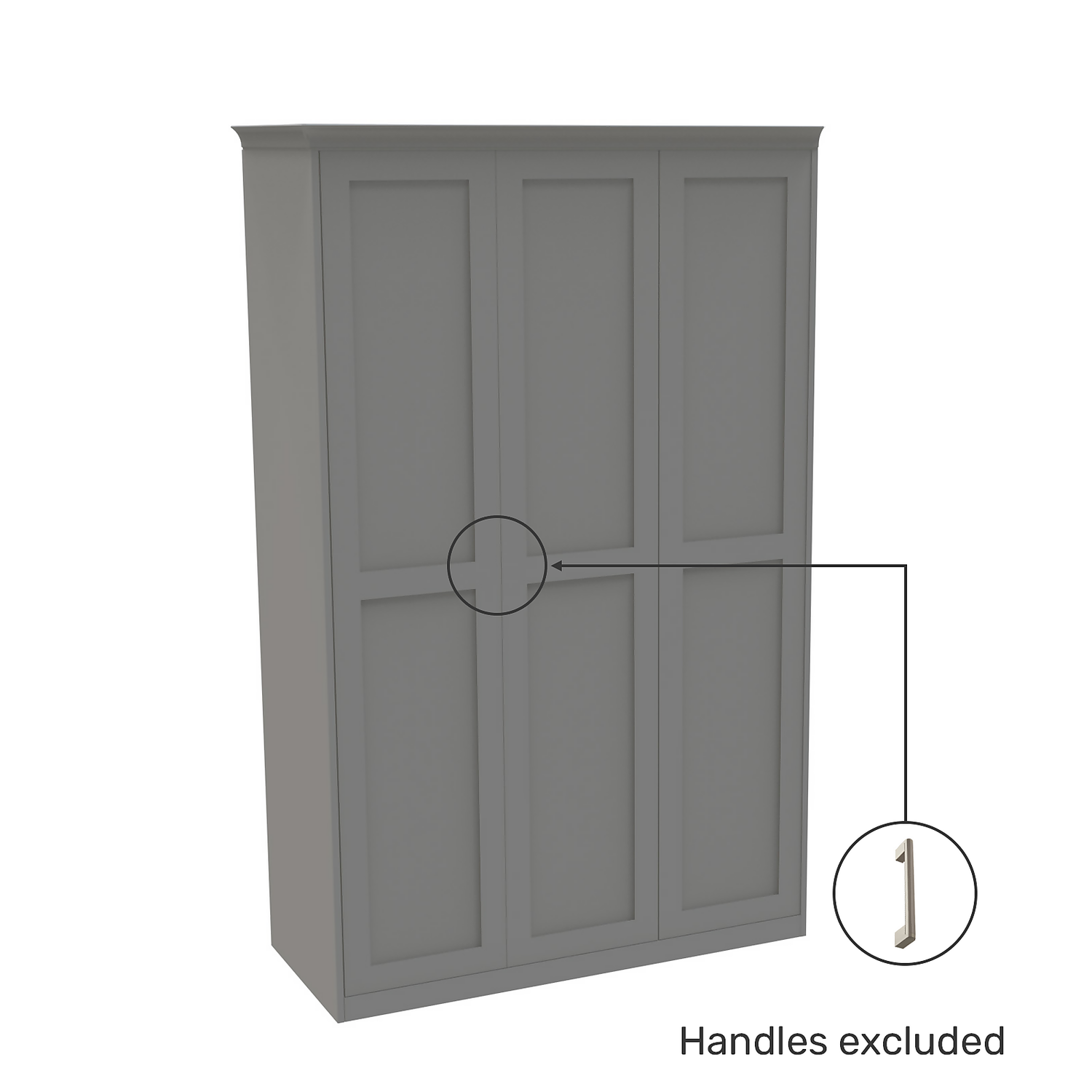 This triple wardrobe (1 x double unit and 1 x single unit) features a grey internal carcass and includes end panels, plinth and matching cornice all in a finish to match the beautiful luxe matt grey shaker doors. The wardrobe features premium soft close clip-on Blum hinges, two shelves and two hanging rails. You can customise your wardrobe with our additional internal storage options (available separately) including internal drawers, shelves, dividing shelves and extra hanging rails. Choose your handles from our range of both traditional and modern to suit your desired look.