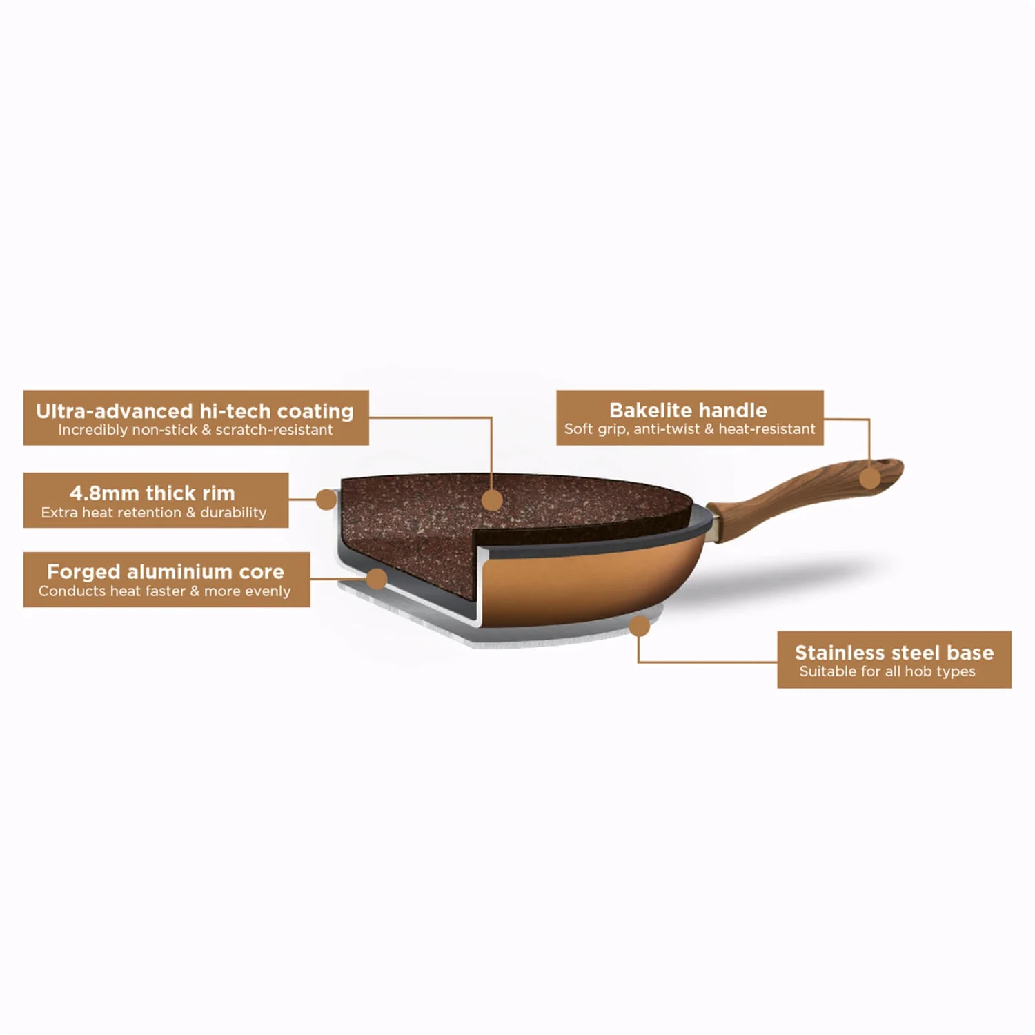 Available in three sizes, Copper Stone Pans give you the strength of stone, the unbeatable non-stick of ceramic and the beauty of copper for the perfect pan.