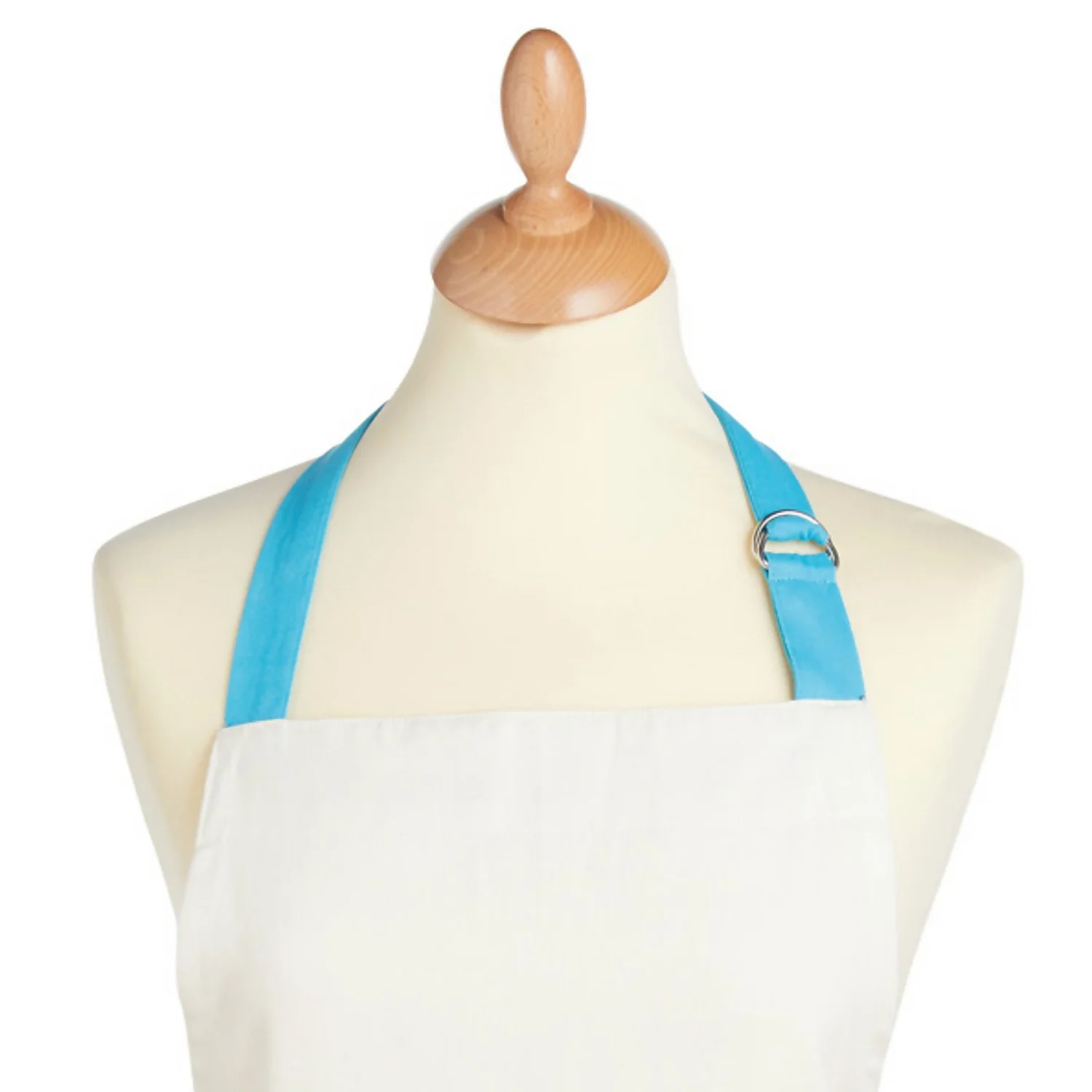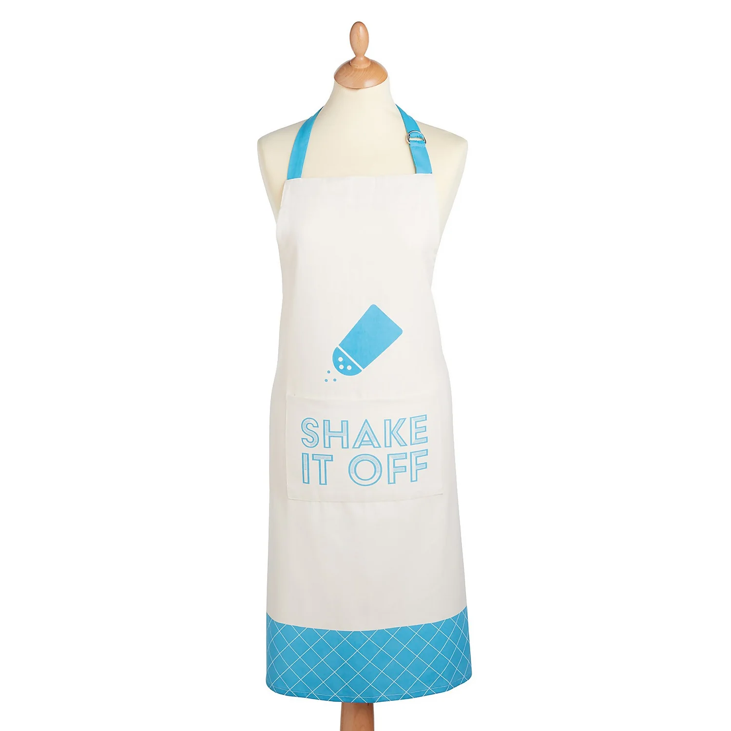 Made of robust 100% cotton, the chefs’ apron features a bright blue flour shaker against a white background, complete with that nugget of modern wisdom, “shake it off”!