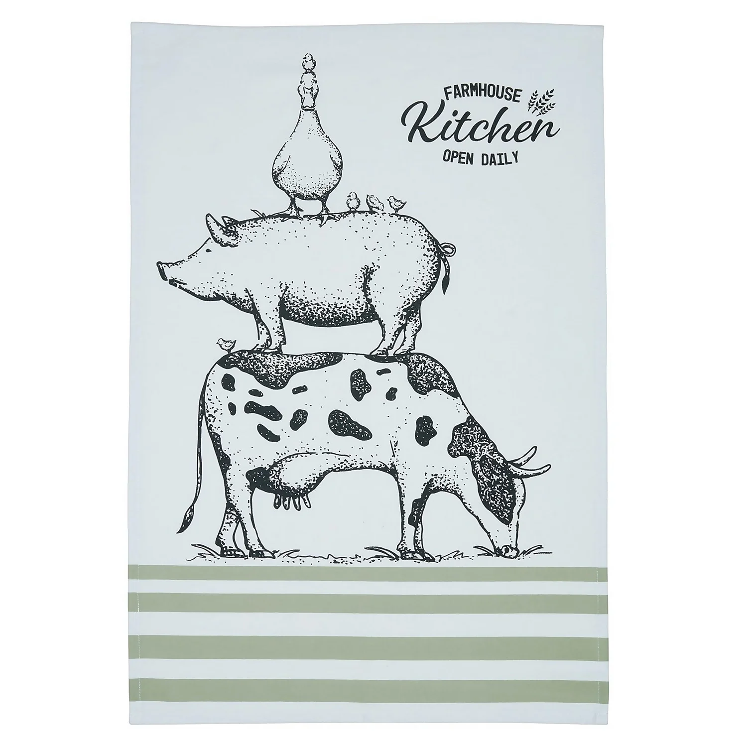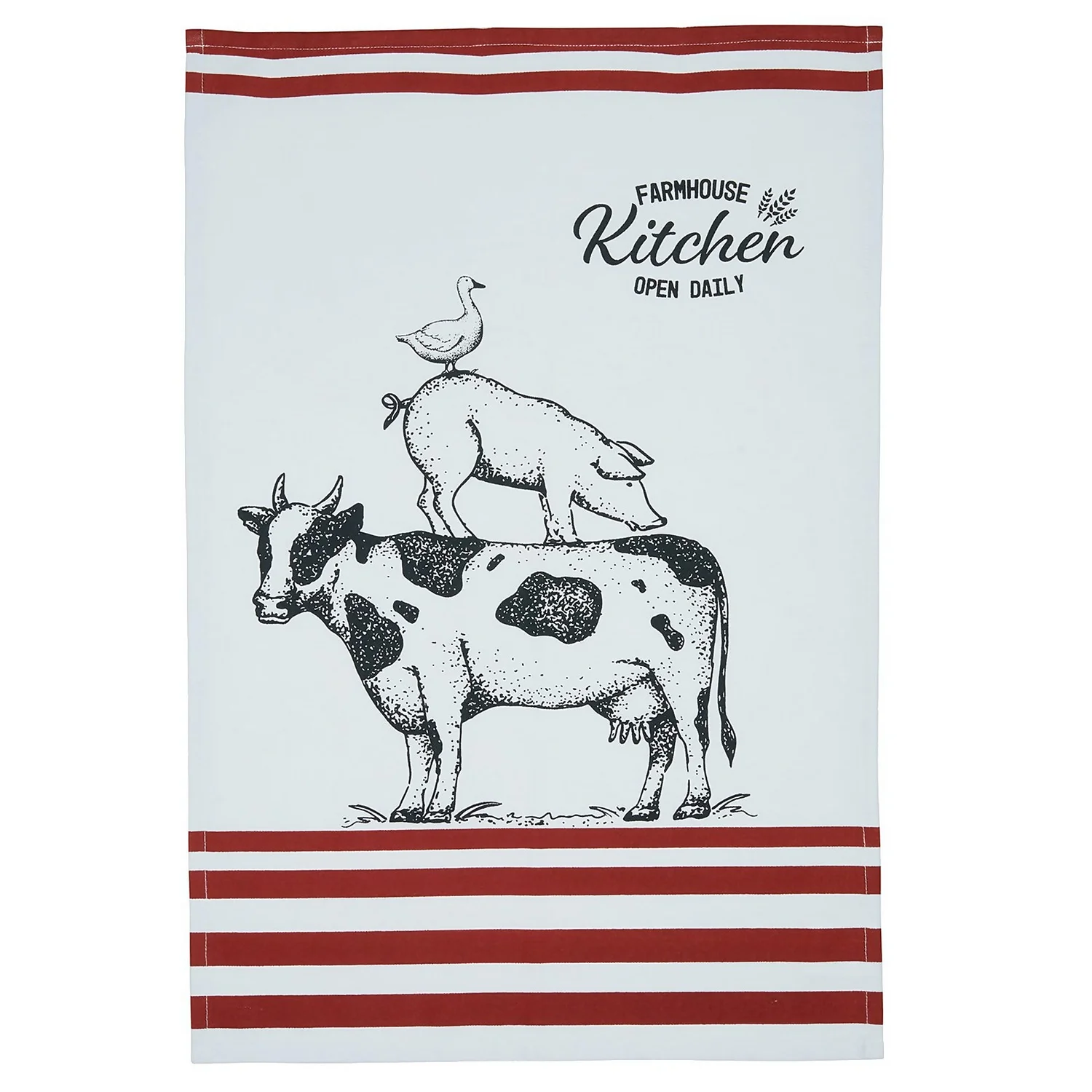 A little touch of farmhouse chic, for any décor. When your kitchen needs a stylish, practical, multipurpose accessory, these ‘Farmhouse’ tea towels are ideal. This pack includes two fun, farmyard-themed tea towels, which will sit comfortably in traditional and modern homes. One features burgundy stripes, while the other features sage green stripes, and both are decorated with a stack of funny farmyard animals, in a hand-drawn style. They’re ideal for wiping up messes from an energetic cooking session, drying dishes, and any other general cleaning duties you may encounter. Each of these animal-themed tea towels is made of high-quality 100% cotton, so you can be sure they’ll last.