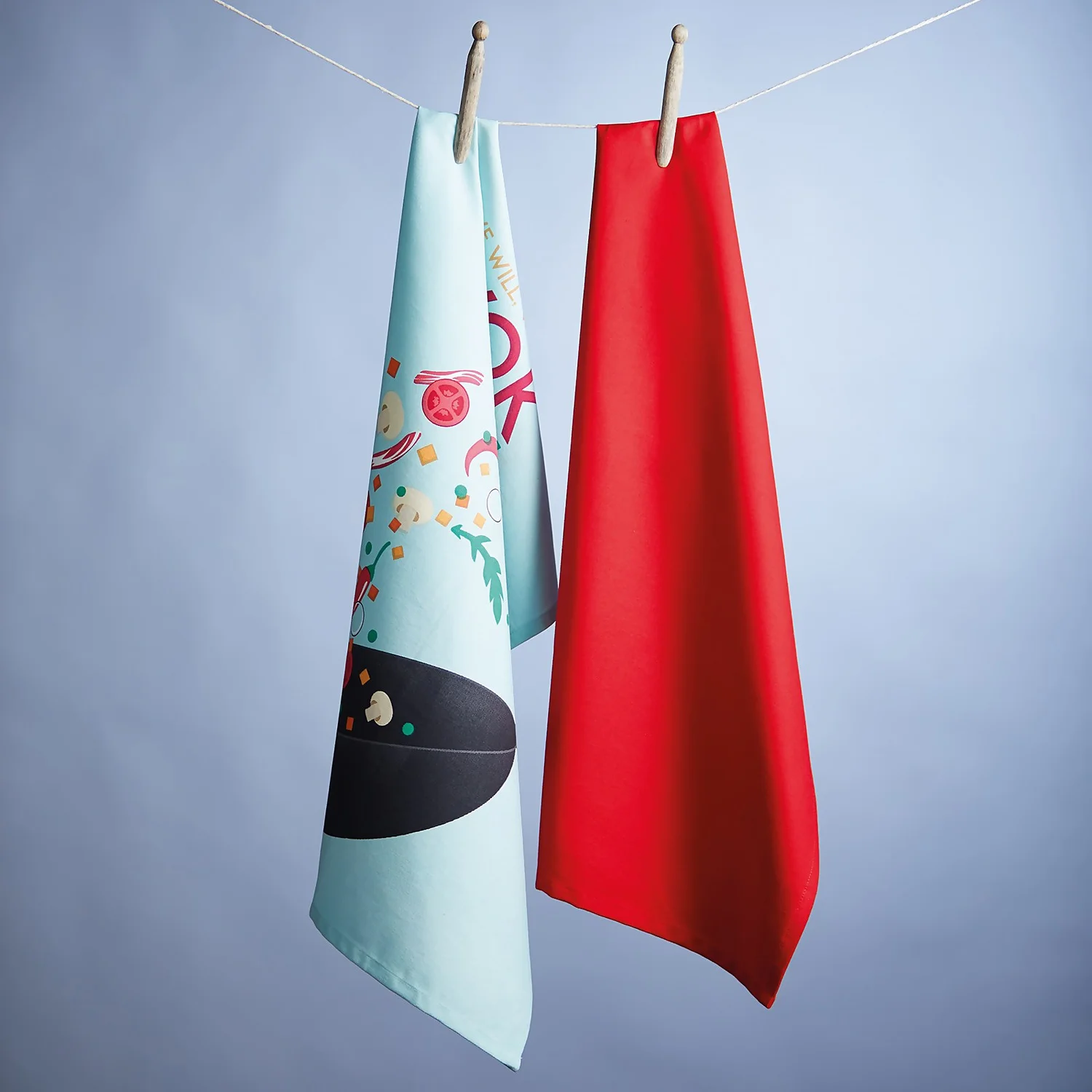 Pun a little fun into your cooking and cleaning routine with these lyrical tea towels. With a humourous, musical-themed motif – “We Will, We Will Wok You” – these novelty tea towels are sure to instil a little light-hearted fun into cooking and cleaning, whether you’re mopping up spills or drying the dishes! No need to make a big song and dance about kitchen duties – this pack of two towels will get things clean and dry, faster than you can stir fry. The set includes a music-themed tea towel, as well as a bright red tea towel. Both are made of 100% high-quality, machine-washable cotton, so you can enjoy your kitchen tea towels for a long time.