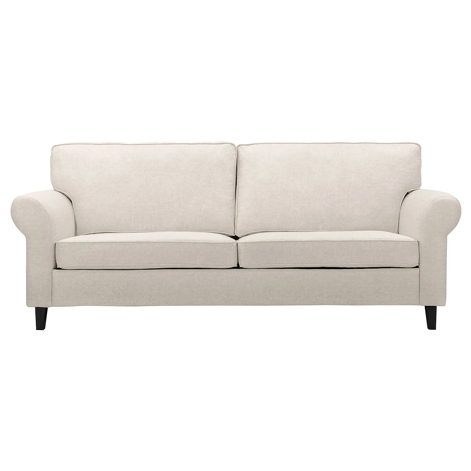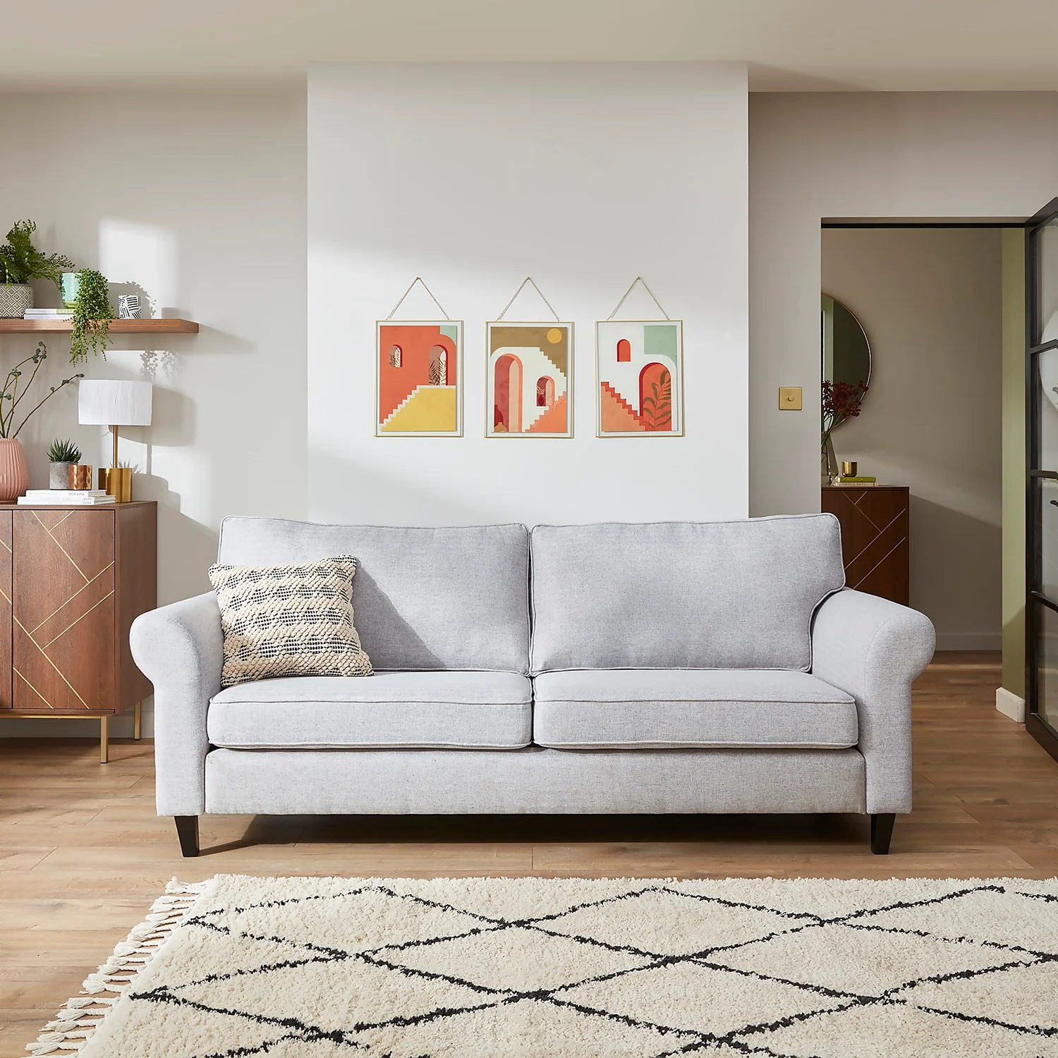 Make the everyday a little more elegant with Linea. Simple yet stylish, this natural 3 seater sofa has a traditional design complete with classic scroll armrests and tapered dark wood legs. The foam and fibre filled cushions are upholstered in woven fabric for added comfort.