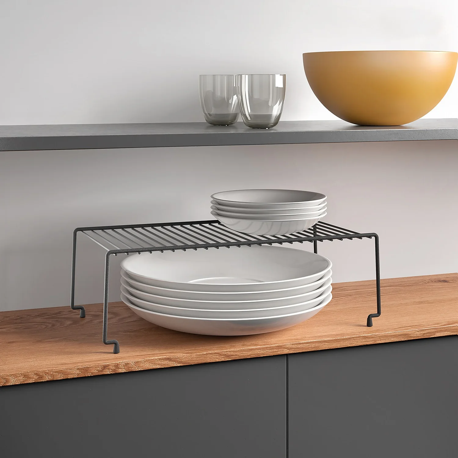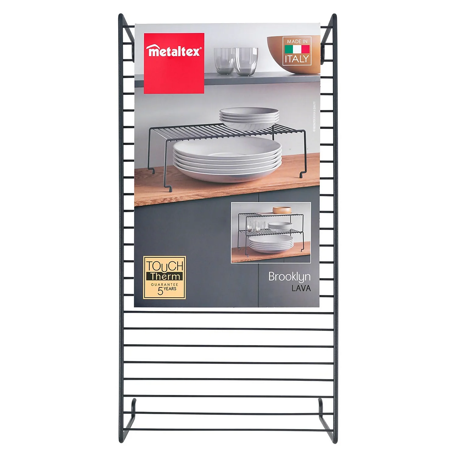 Lava line Brooklyn Space Saving Stackable Shelf. Can be used single or stackable by adding another unit. Instantly double cupboard space, perfect for stacking plates, bowls and food items. New trendy wrought iron look, high quality black Touch-Therm coating, long-lasting, rust and dust resistant. Easy to clean, simply wipe clean with damp cloth. Made in Italy.