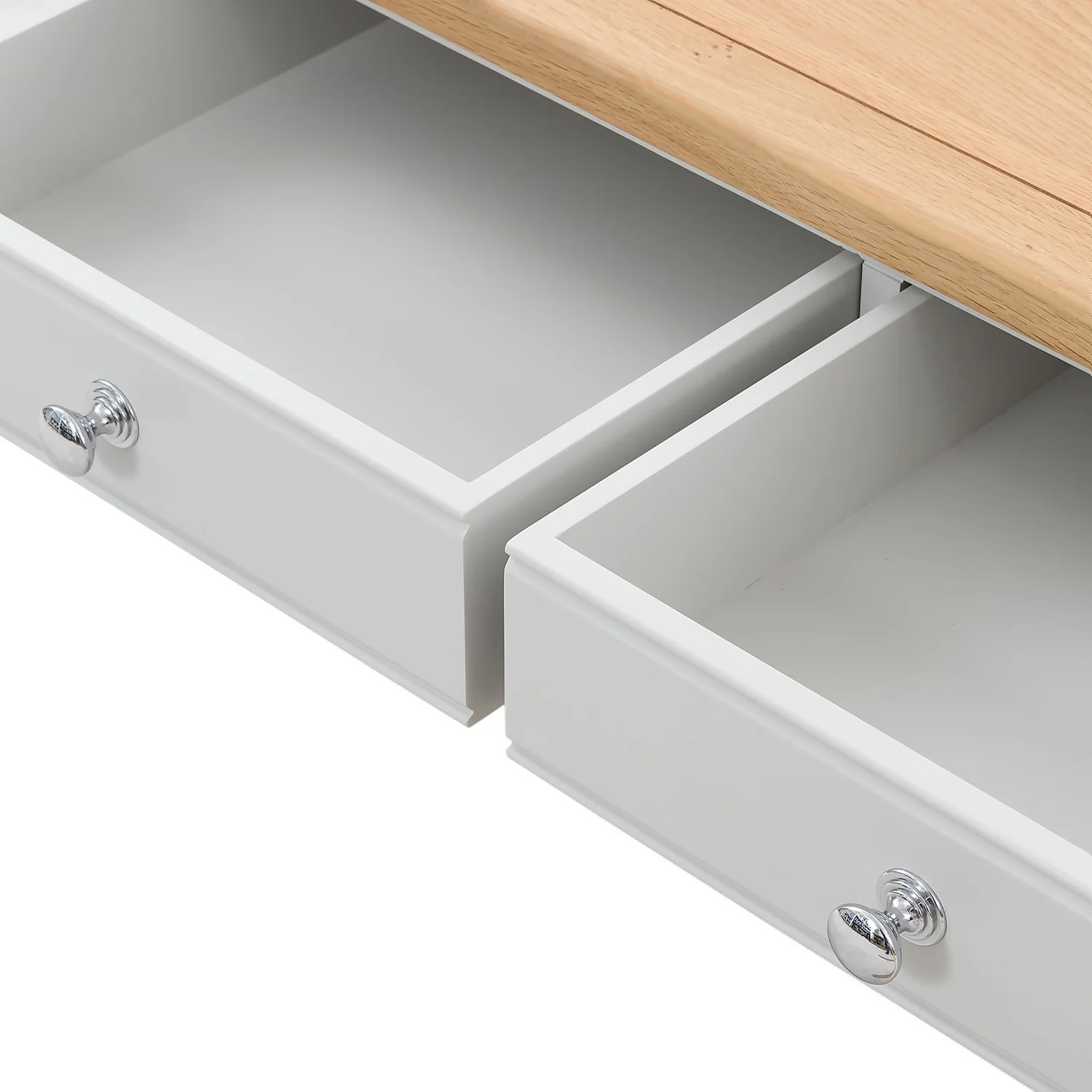Traditional style at its best. The hand-painted Westcott exudes timeless country chic with its two-tone finish, panelled drawer fronts and elegant hand-crafted turned legs. The fresh ivory tone gives this coffee table a modern lift. It features 2 drawers to house your remote controls, mail, and magazines. The large open shelf can be used to stack your books or show off an ornament or two. A substantial table, it’s ideal for socialising, making the perfect perch for your drinks and nibbles. It makes a great stand-alone piece or team it with other items in the Westcott collection for a cohesive look.